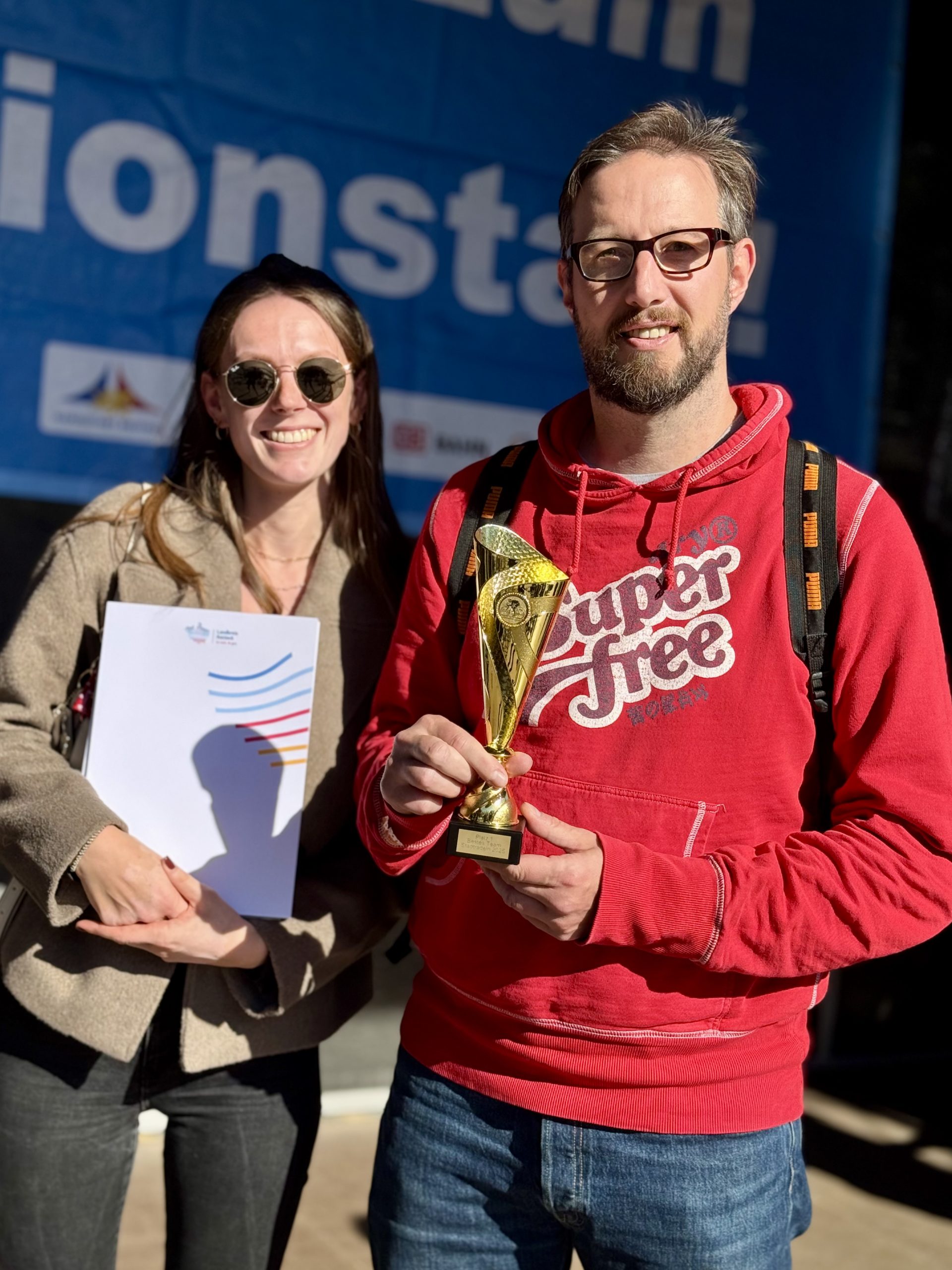Bei bestem Sonnenschein nahmen Jenny und Tobi, die während des 21-tägigen Aktionszeitraums selbst fleißig Kilometer sammelten, stellvertretend den Preis entgegen.